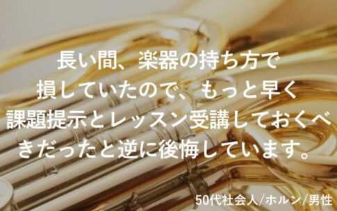レッスンレビューレッスンでハイトーンが気持ちよく出せたことでまたホルンを吹くのが楽しくなりました。