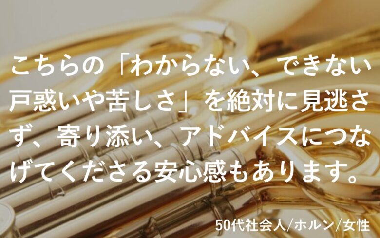本番で過度に緊張することが長年の大きな悩みでしたが、「できないこと」に対する具体的な解決策をレッスンで学ぶうちに、本番での緊張はかなり減りました。