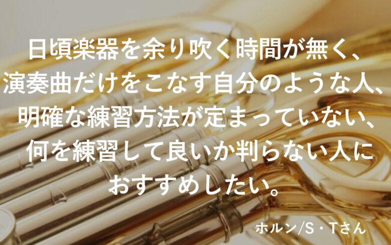 日頃楽器を余り吹く時間が無く、演奏曲だけをこなすような自分のような人、 明確な練習方法が定まっていない、何を練習して良いか判らない人におすすめしたい。