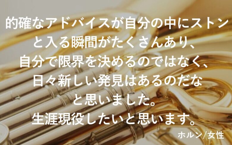 ・去年よりも音の出し方が安定していたつもりで、自分はここまでしかできないと聞けてしまっていたところ、レッスンでまだ自分に伸びしろがあることを気づきかせてもらえました。また自分の技術とメンタルのバランスの大きな違いに自覚なかったところを気づかせてもらえました。