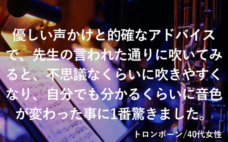 優しい声かけと的確なアドバイスで、先生の言われた通りに吹いてみると、不思議なくらいに吹きやすくなり、自分でも分かるくらいに音色が変わった事に1番驚きました。